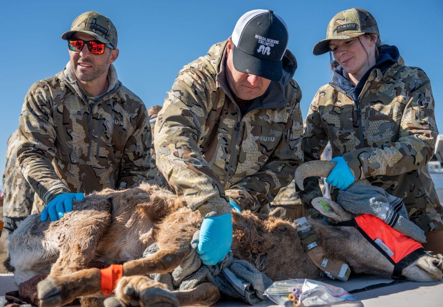 PHOTO CAPTION: Volunteers with KUIU, NDOW, and NBU safely prepare a bighorn sheep for transport