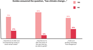 Another common trend noticed by the surveyed guides is shorter and shifting seasons. Primarily, guides have observed less and less snowfall over the years. One guide mentioned that “the alpine routes in Washington have changed a lot and have started to go out of season or become dangerous earlier and earlier. It becomes even more obvious when you look at beta photos from 20-40 years ago and find drastically different conditions at the same time of year. Smoke from wildfires also affects what objectives you can do. Last summer we saw the highest temperatures the state has seen. Aside from causing snow to melt, dangerously hot conditions meant there were swarms of mosquitos at alpine elevations where you would have never previously expected to see them.” In the Andes, where there used to be two defined seasons (dry and rainy), guides are now seeing a lack of distinction between the seasons and more periods of drought. In Chamonix, guides notice shorter winters and longer summers. In Nepal, a guide commented on less snow and ice in the mountains and significant rain during the month of October, for the first time in decades. One U.S.-based guide mentioned that the winters in the Northeast seem to be shifting later (now January through April vs. previously December through March). In Moab, Utah, guides have noticed a pattern of dryer and warmer winter months. One guide said “I recently guided a mountain biking tour in January, which previously had never happened with either of the guiding companies I have worked with.”