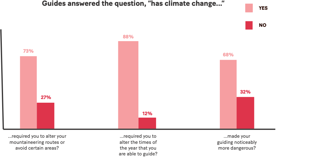 75% of survey respondents have been guiding for over a decade, and an astounding 98% answered “yes” when asked if they have noticed the effects of climate change throughout the years they have been a mountain guide. A similar percentage of surveyed guides also commented that these aforementioned climate changes have required them to alter their mountaineering routes, the times of the year they are able to guide, or, in some cases, are now forced to avoid certain areas altogether. 68% of guides said that climate change has made their guiding noticeably more dangerous.