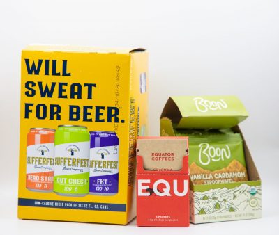 The Weekender Bundle includes: A 5-pack of Equator instant coffee, 10-pack of Boon Vanilla Cardamom Stroopwafels, and Sufferfest’s Mixed 6-Pack.