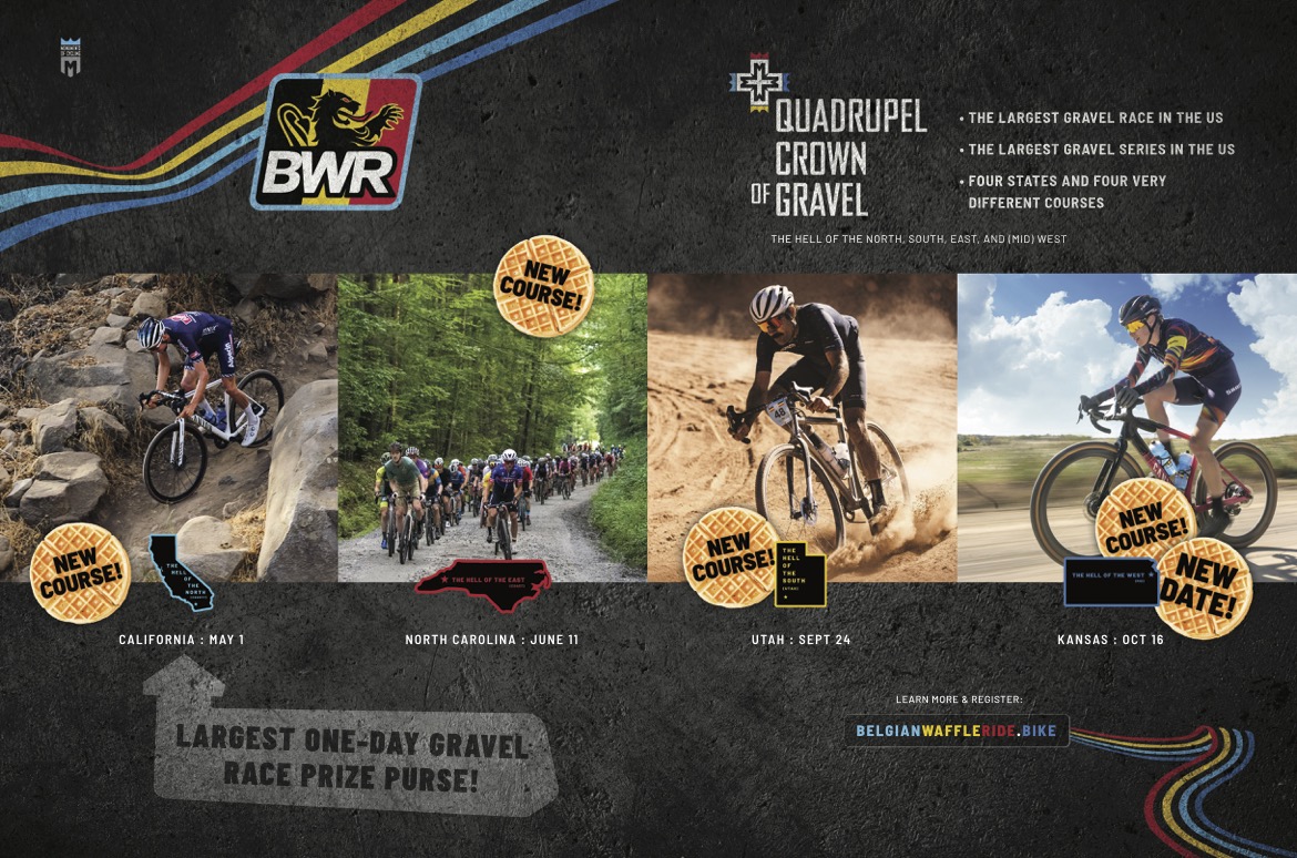 San Diego, CA – January 6, 2022/OUTDOOR SPORTSWIRE/ – Monuments of Cycling (MoC), a premier cycling events producer best known for its iconic Monument of Gravel, the Belgian Waffle Ride (BWR), announced on Tuesday the prize purse for the BWR CA on April 30, 2022 will be the largest ever for a gravel race with over $50,000 in cash and prizes being distributed between the top five men and women, inclusive of a $5,000 purse and prizes for the top three junior riders, 18 and under, who compete in the Waffle. The BWR CA is the first stop of the 2022 Quadrupel Crown of Gravel Series, which will feature its own soon to be announced prize purse for the top four male and female riders with the lowest cumulative times for the four-race series. The Quad includes the Hell of the North, South, East and (Mid) West.