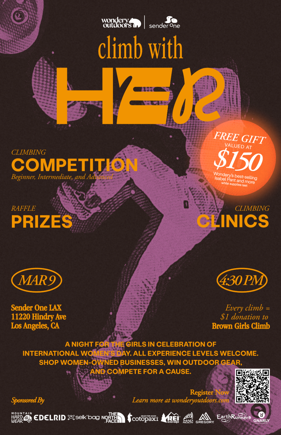 Climb With Her will be held at Sender One LAX from 4:30 PM to 7:30 PM on Saturday, March 9th. The event is open to all abilities and raises money for Brown Girls Climb, a national non-profit community partner that strives for representation in the outdoors and climbing for People of the Global Majority. All funds from clinic registrations, raffle ticket purchases, and competition entry donations will go directly to the group along with $1 for every climb completed during the event. The Climb With Her festival will also highlight a women-owned marketplace to further promote and support women and local businesses.